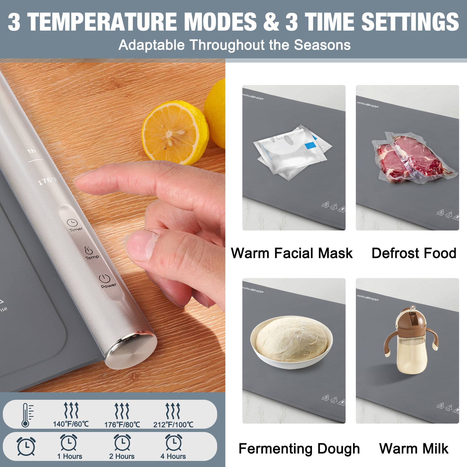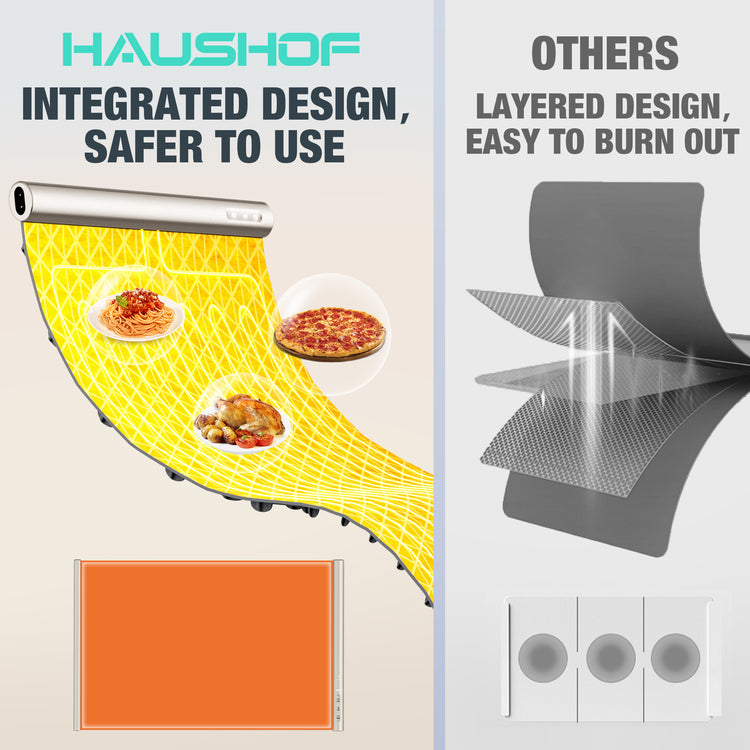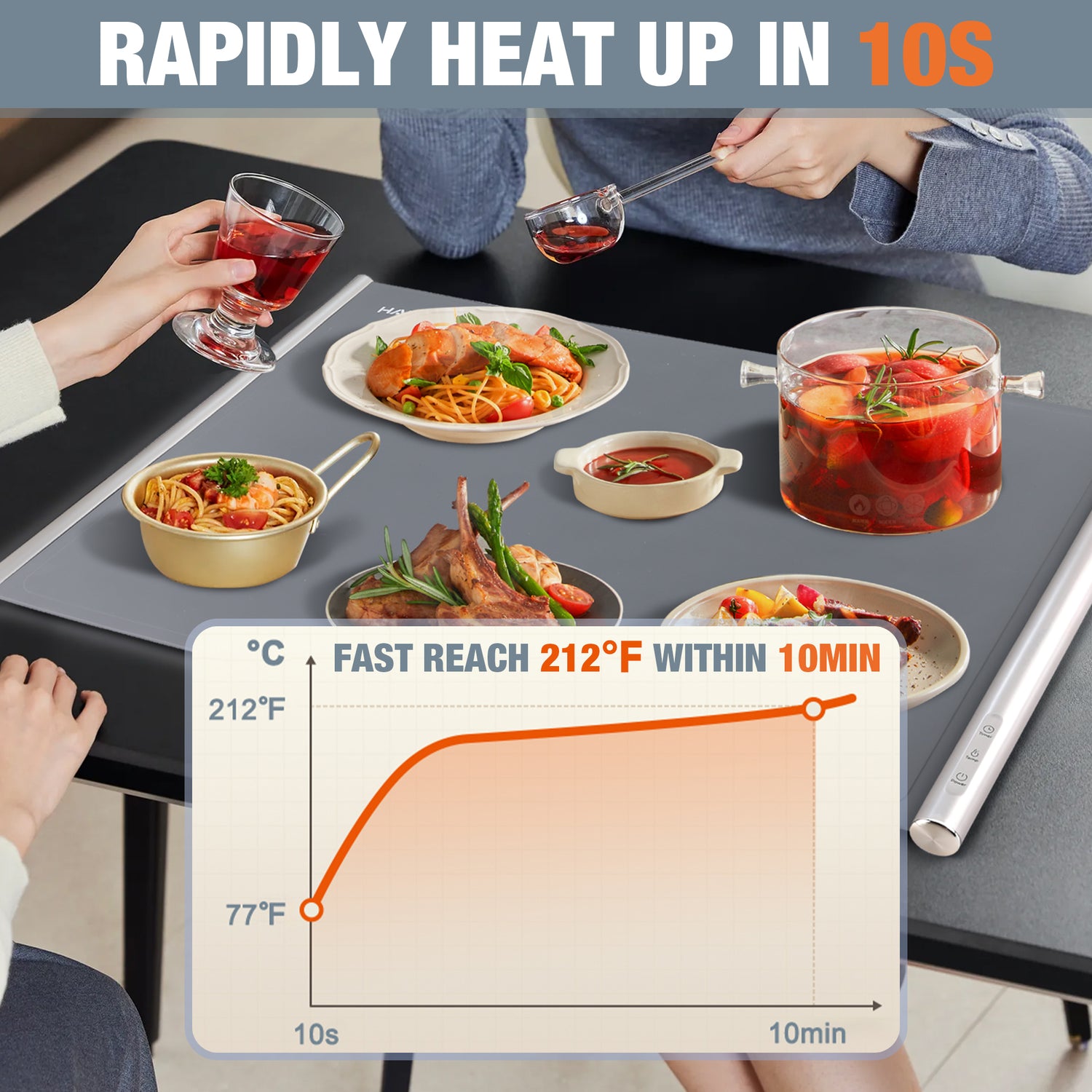 - The HAUSHOF warming tray features advanced heating technology, with heating wires that cover the entire surface of the mat for quick and even heat distribution, fast heating up at 10 seconds. The mat offers three adjustable temperature settings: 140°F, 176°F, and 212°F, catering to different heating needs for various occasions. The mat has three heating time settings—1 hour, 2 hours, and 4 hours—allowing you to easily customize your heating time based on your specific needs, offering both convenience and control
