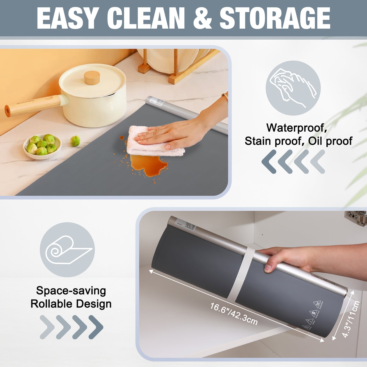 - The food warming mat is designed for ultimate convenience, being easily rollable for quick and compact storage, saving precious space in your kitchen or dining area. The mat’s deep gray color is not only aesthetically pleasing but also more practical than lighter colors, as it resists dirt and stains better. The surface is made from premium nano-silicone, which is both durable and easy to clean. Spills or stains can be easily wiped away, keeping the mat looking fresh and new with minimal maintenance