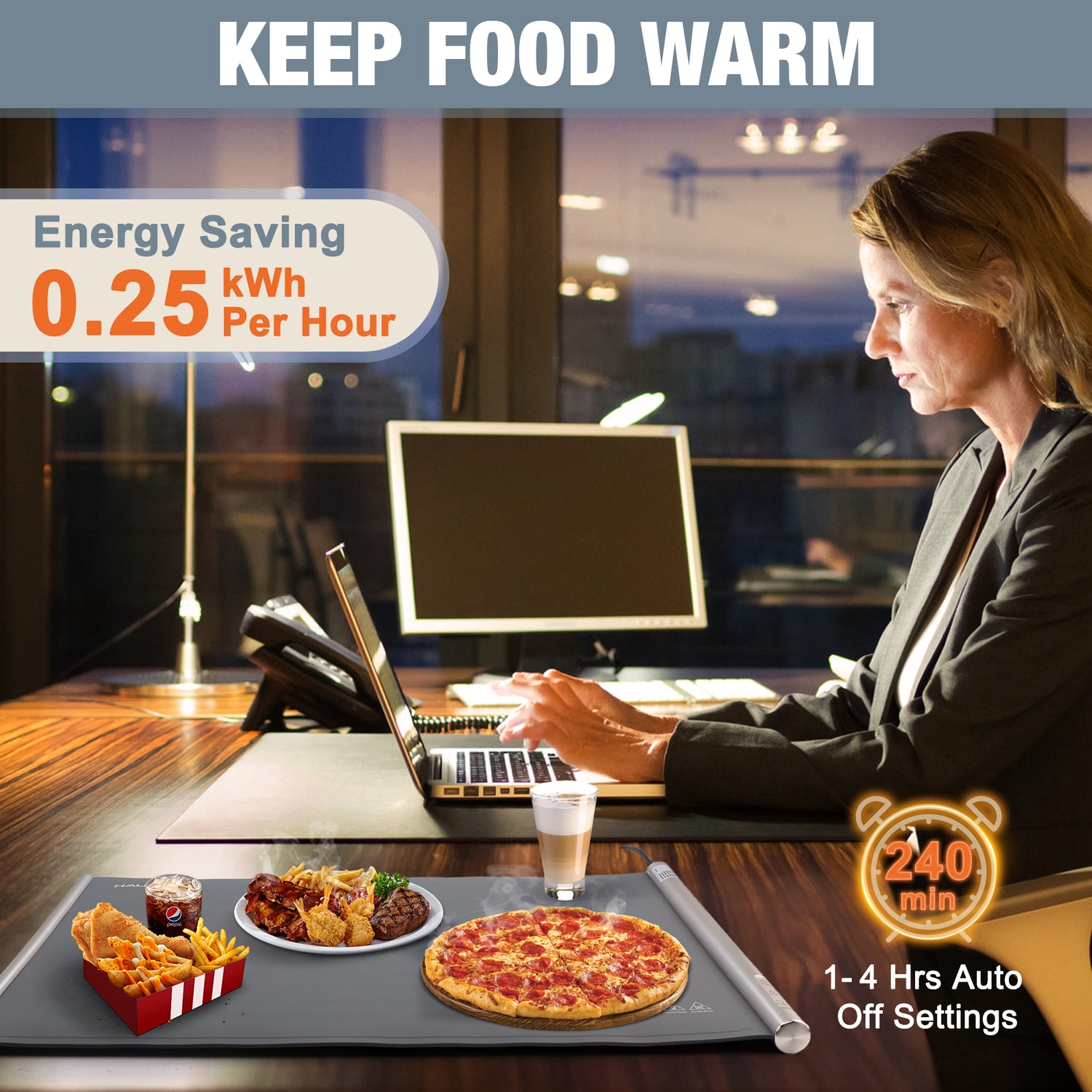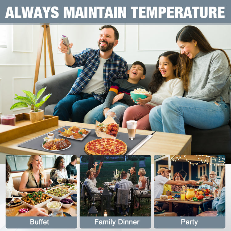 - This warming mat is designed to work with various cookware materials, including glass, stainless steel, and ceramic. It's perfect for keeping your dishes warm during large family gatherings, holiday celebrations, or social meals with friends. Whether you're hosting a special event or enjoying a cozy dinner with loved ones, this mat ensures that your food stays at the ideal temperature throughout your meal